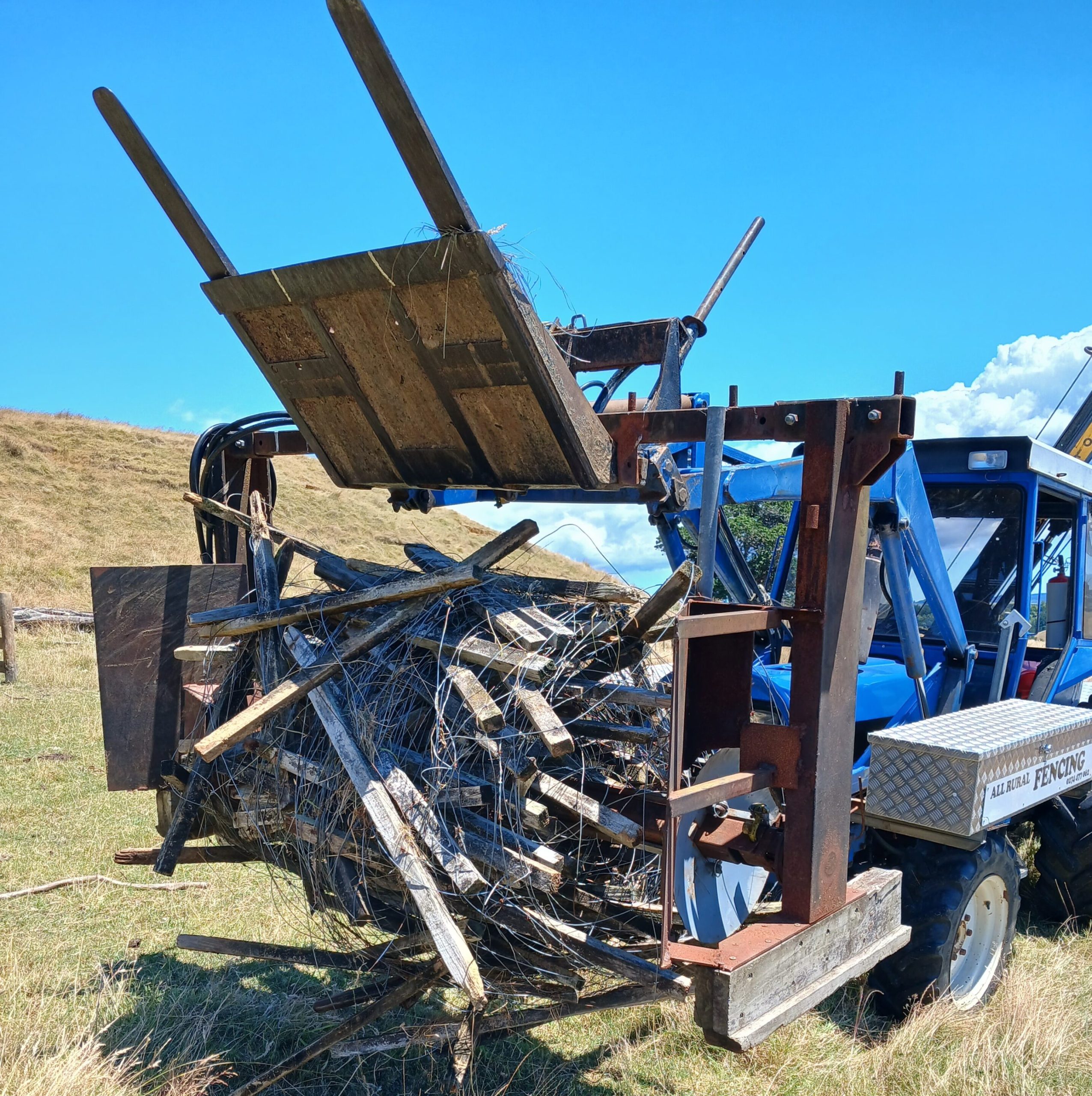 We also pull out a lot of fences, some of them very rubbishy, using my designed V-lifter for lifting posts, and a hydraulically driven old fence winder, which winds up old fence with wires and battens still attached.