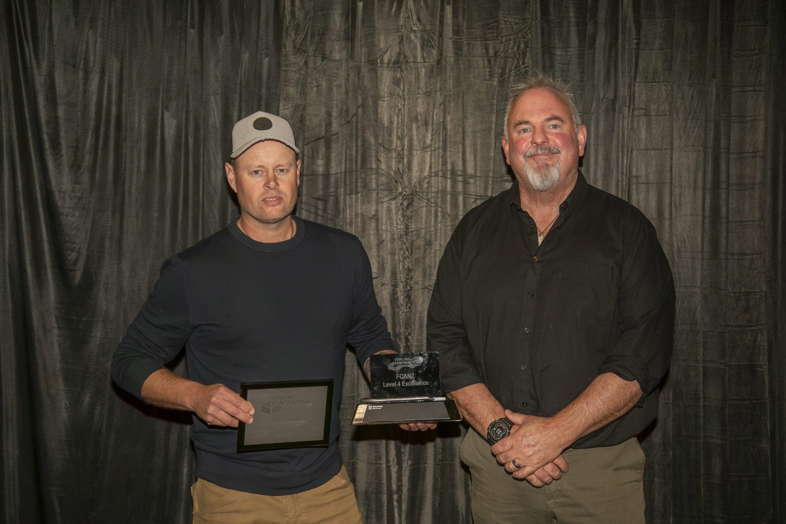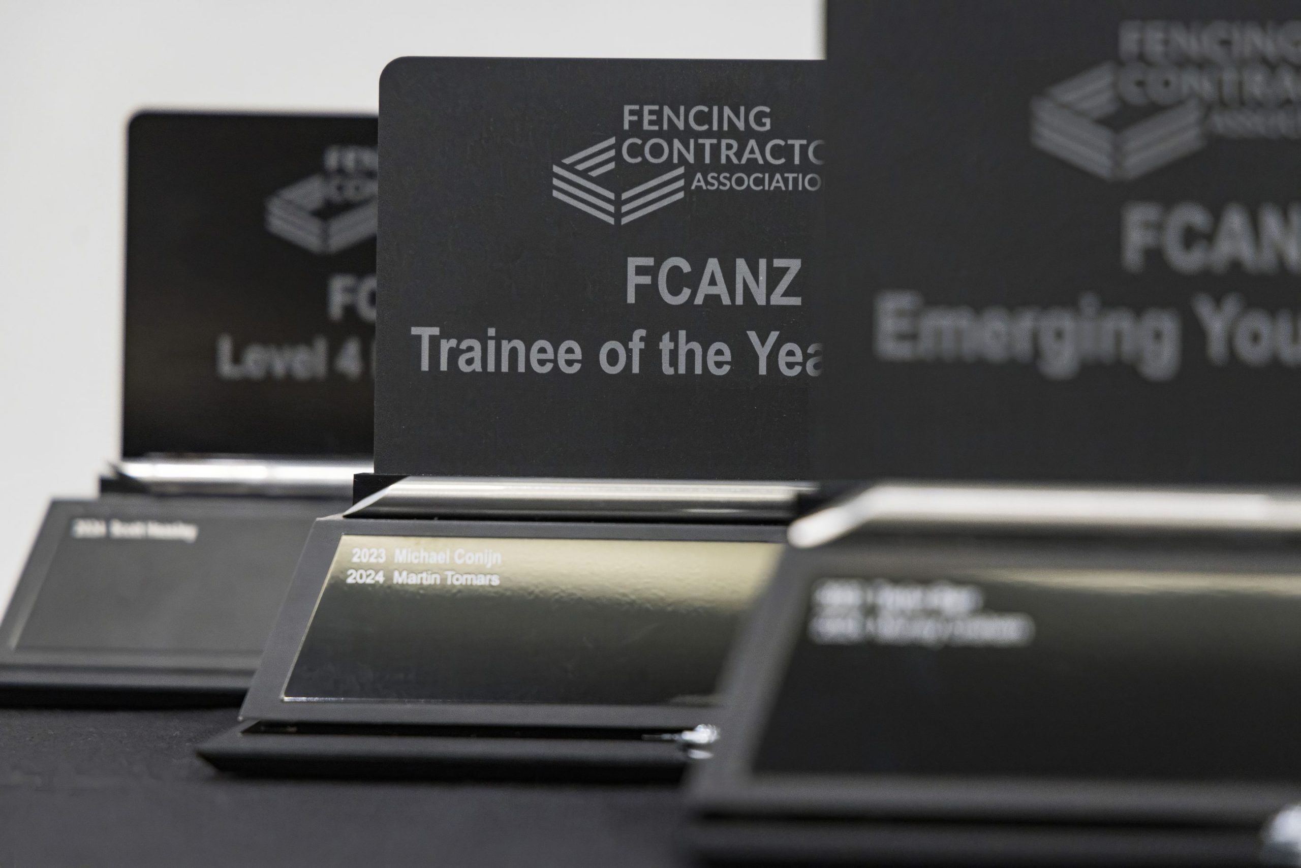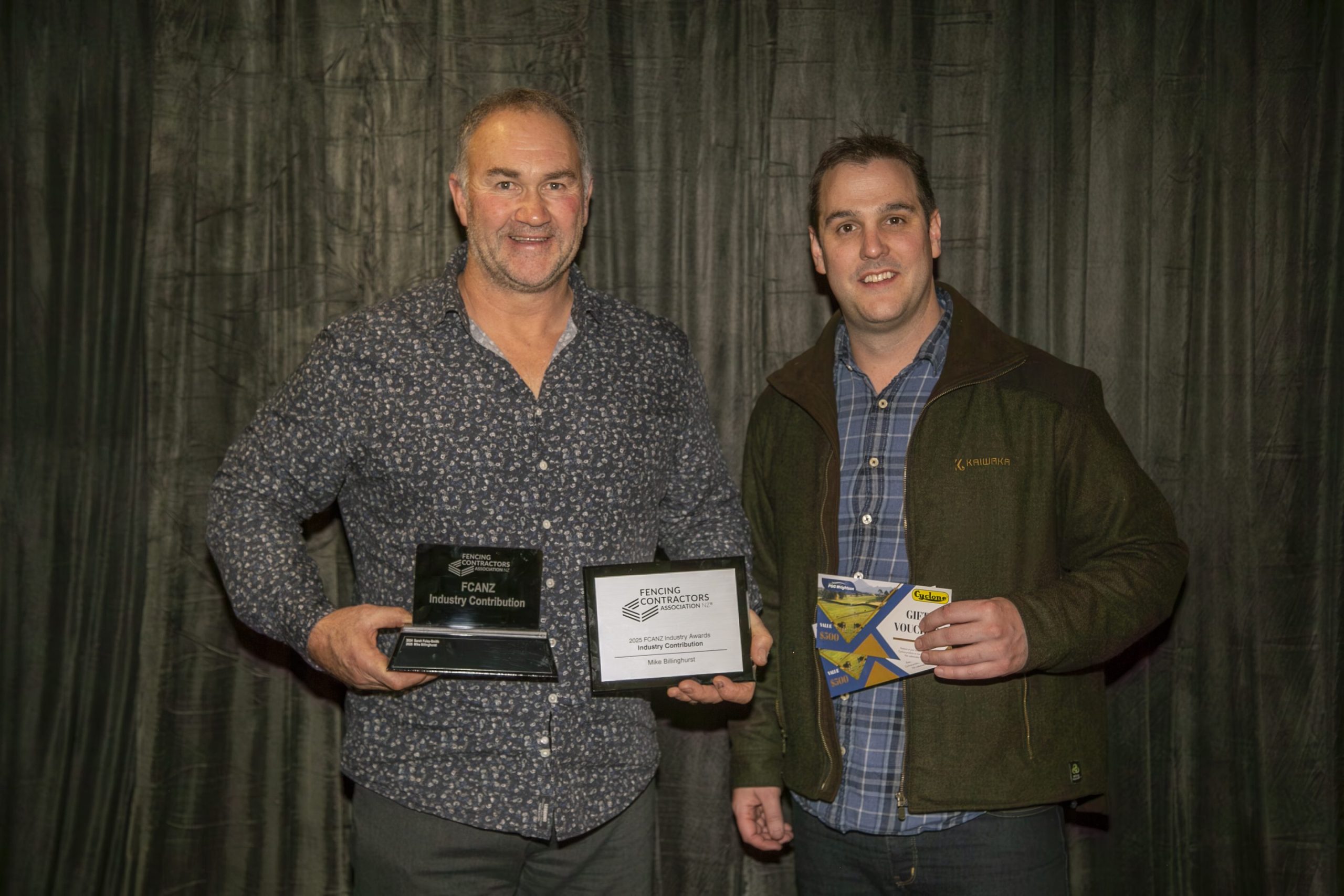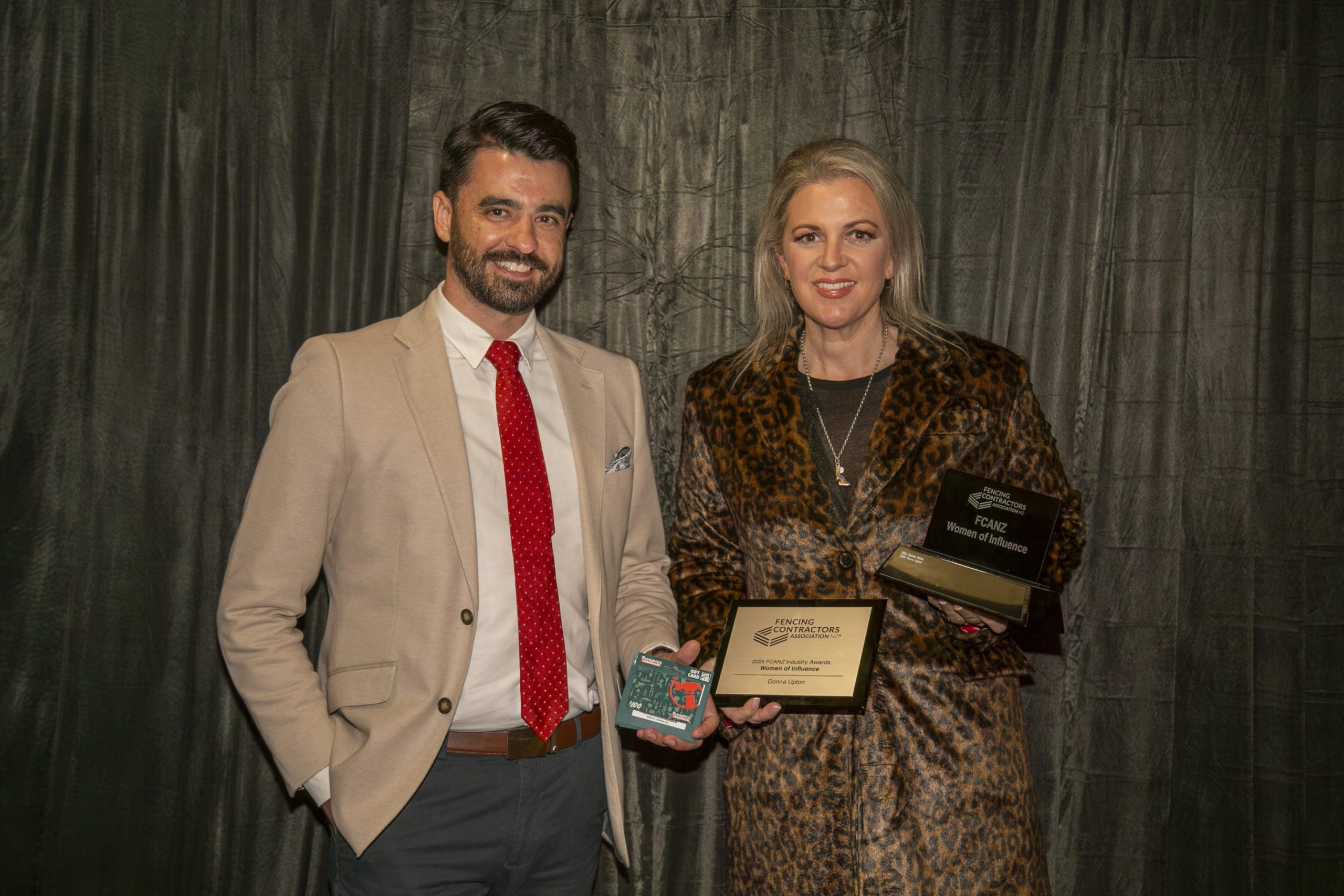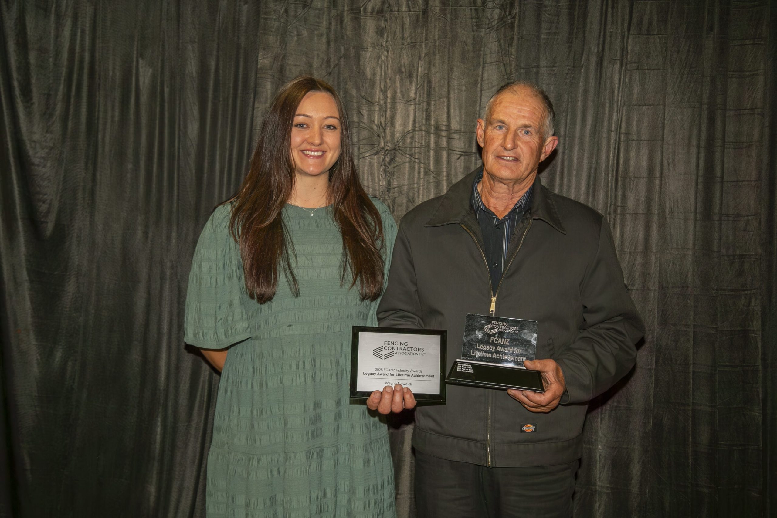 2025 Industry Awards Justin Tilly from NorthTec - Tai Tokerau Wānanga with Dan French, winner of the Certificate in Fencing Level 4 Excellence Award. Dan received a batten stapler thanks to Delfast as part of his prize.Joseph Lord from Stockade NZ with Galen Monks, winner of the Emerging Talent (Youth) Award. Galen also received a batten stapler thanks to Stockade NZ.David Nutsford from PGG Wrightson Ltd with Mike Billinghurst, winner of the Industry Contribution Award. As part of his award, Mike received $1000 of vouchers thanks to PGG Wrightson Ltd.Carey McEwan from Bunnings Trade New Zealand with Donna Upton, winner of the Women of Influence Award. As part of her award, Donna received $1000 of vouchers thanks to Bunnings Trade New Zealand.Naomi Abraham from Farmlands with Wayne Newdick, the recipient of our 2025 Legacy Award for Lifetime Achievement. Wayne received a lifetime FCANZ membership and $1000 of vouchers thanks to Farmlands Co-operative. Post navigationPrevious post: Conference